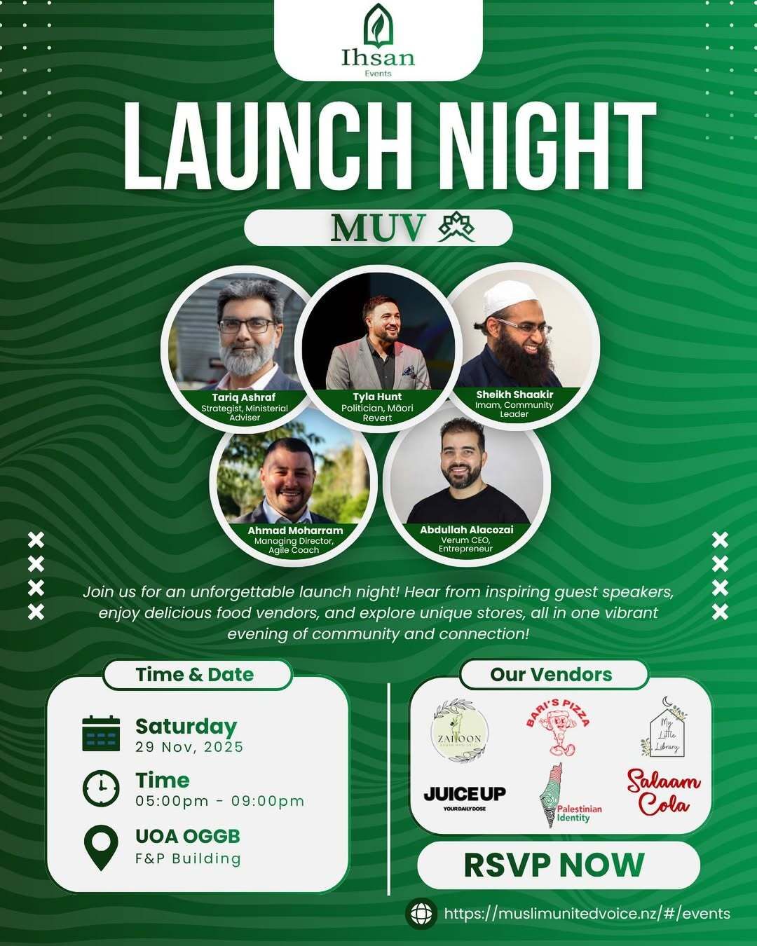 #5 Darussalam NZ - Power of the United Ummah ( link ) When: 8:20pm | November 29th Where: 72 Carr Road, Mt Roskill Cost: N/A Sign up: N/A | #6 MUV - Launch Night ( link ) When: 5pm-9pm | November 29th Where: UOA OGGB (F&P Building), University of Auckland Cost: N/A Sign up: N/A |